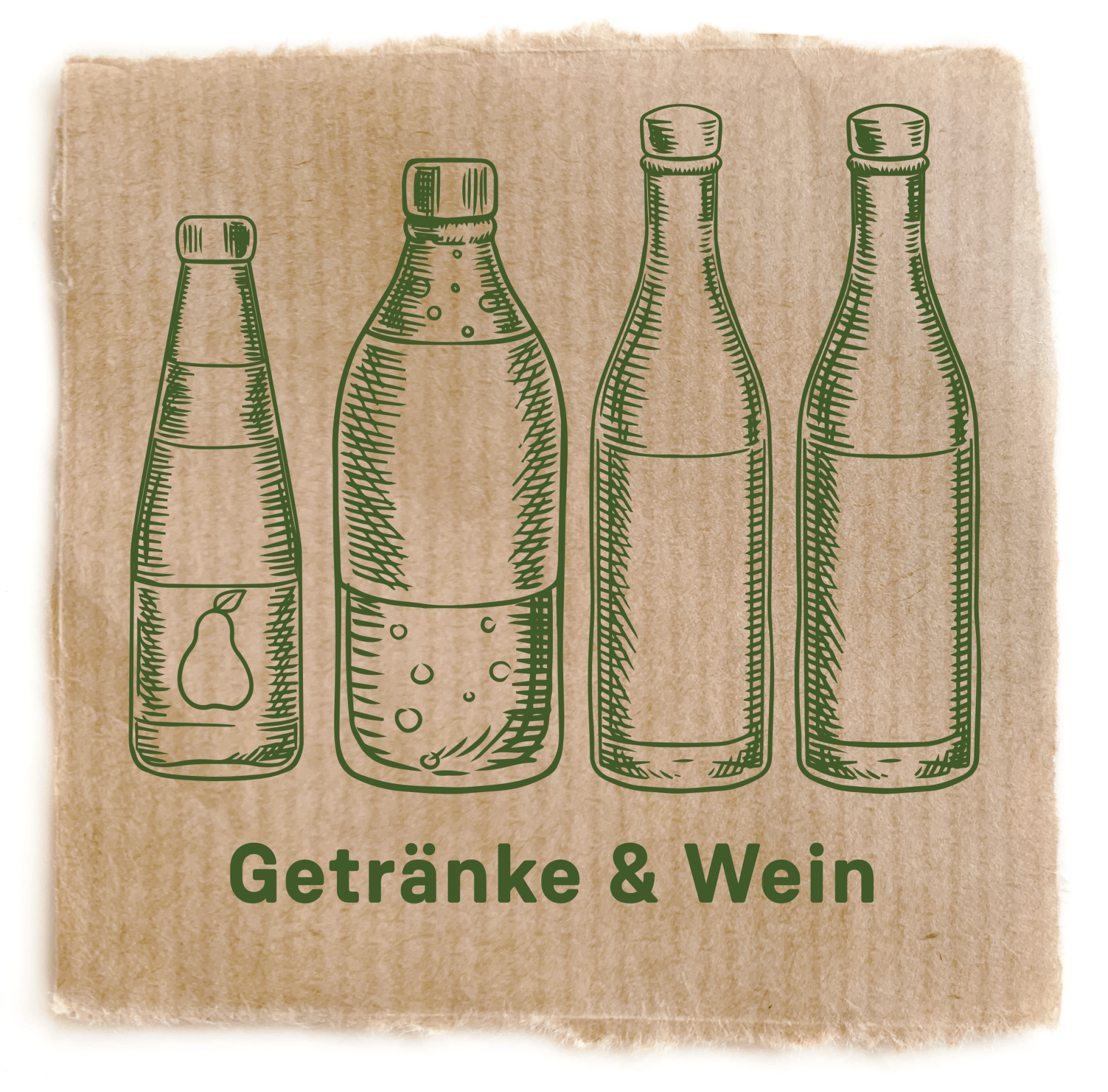 Unsere Getränke (Saft, Wasser, Limo, Bier) sind zu 99% in Glasfaschen. 97% davon sind Mehrwegflaschen. Auch alle 1L Weinflaschen sind Mehrweg. Also austrinken und zurückbringen. Wir sorgen dafür, dass sie wieder voll werden.