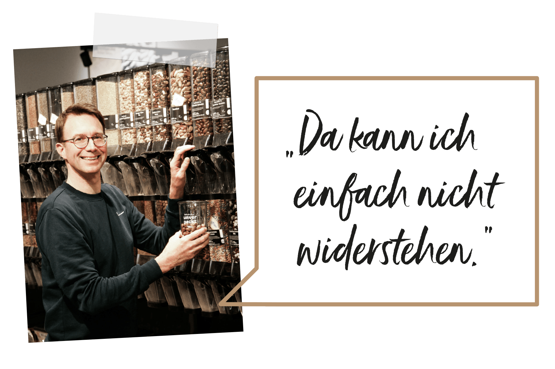 „Cashews in Vollmilch Schokolade aus unserer Unverpackt Station. Da kann ich einfach nicht widerstehen. Manchmal nehme ich Abends nach Ladenschluss noch zwei Hand voll mit. Aber auch die anderen schokolierten Sorten sind super: Rosinen, Haselnuss, Studierendenfutter, Cranberries, Ingwer und Mandeln.“ Björn Kollweier